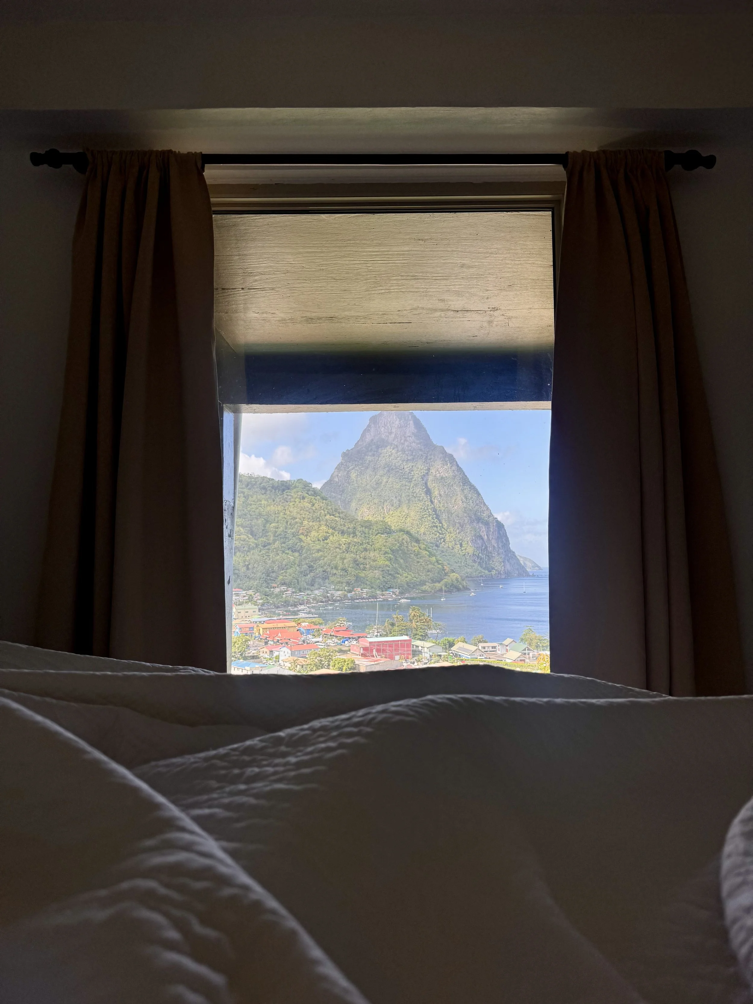 I booked the cheapest room available that had a balcony, which happened to be a 2 bedroom suite with a living room. Neither bedrooms had doors, which was fine by me since I was solo traveling, but could be interesting if you’re traveling with others. My bed had an incredible view of Petit Piton (a UNESCO World Heritage Site). I left my window curtain open just so I could wake up and see it first thing in the morning.