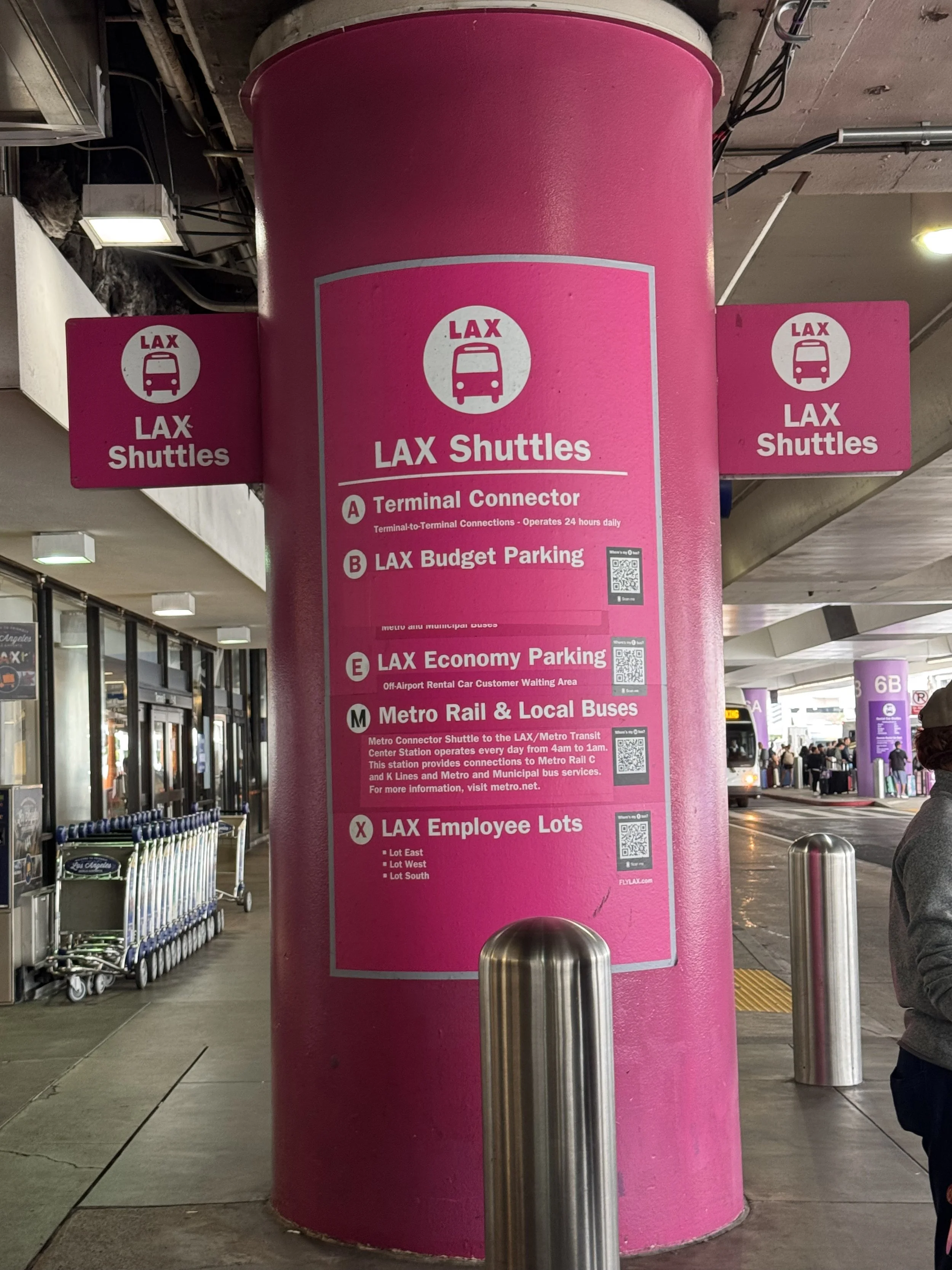 Look for the pink LAX Shuttles signs outside the arrivals terminal (lower level). The “Metro Connector” shuttle takes you to the LAX/Metro Transit Center Station, where you can catch city buses and the Metro C and K lines.
