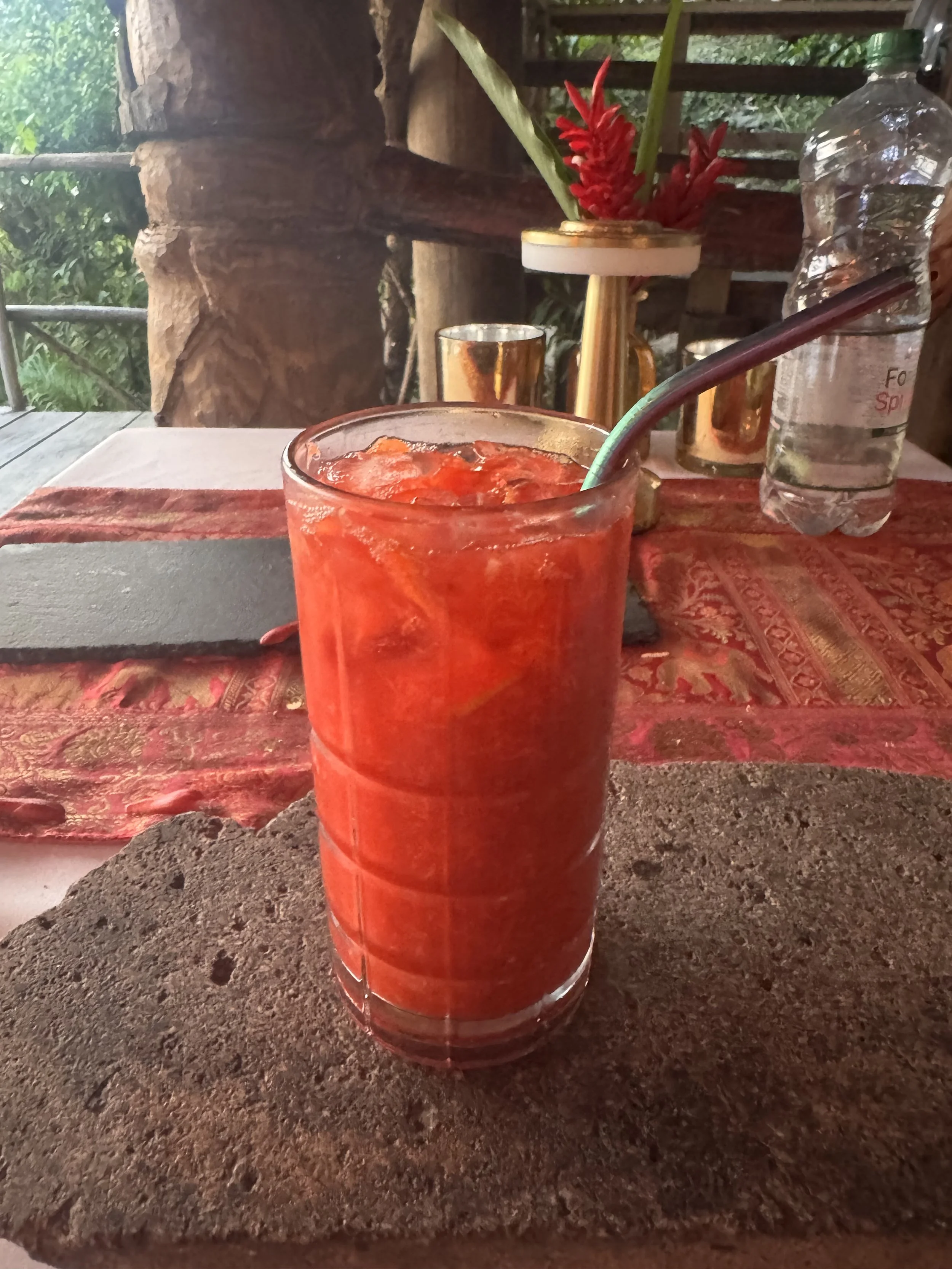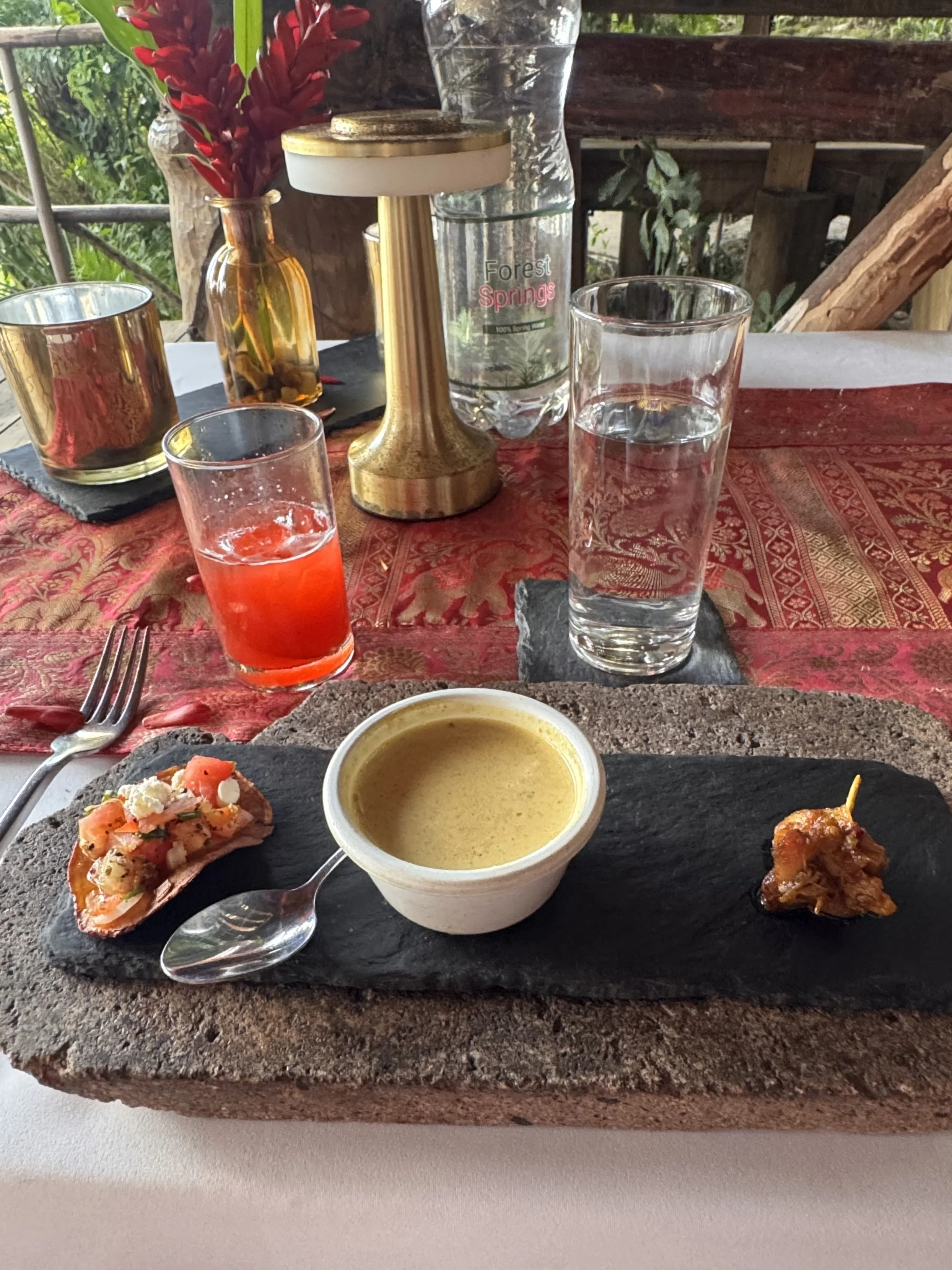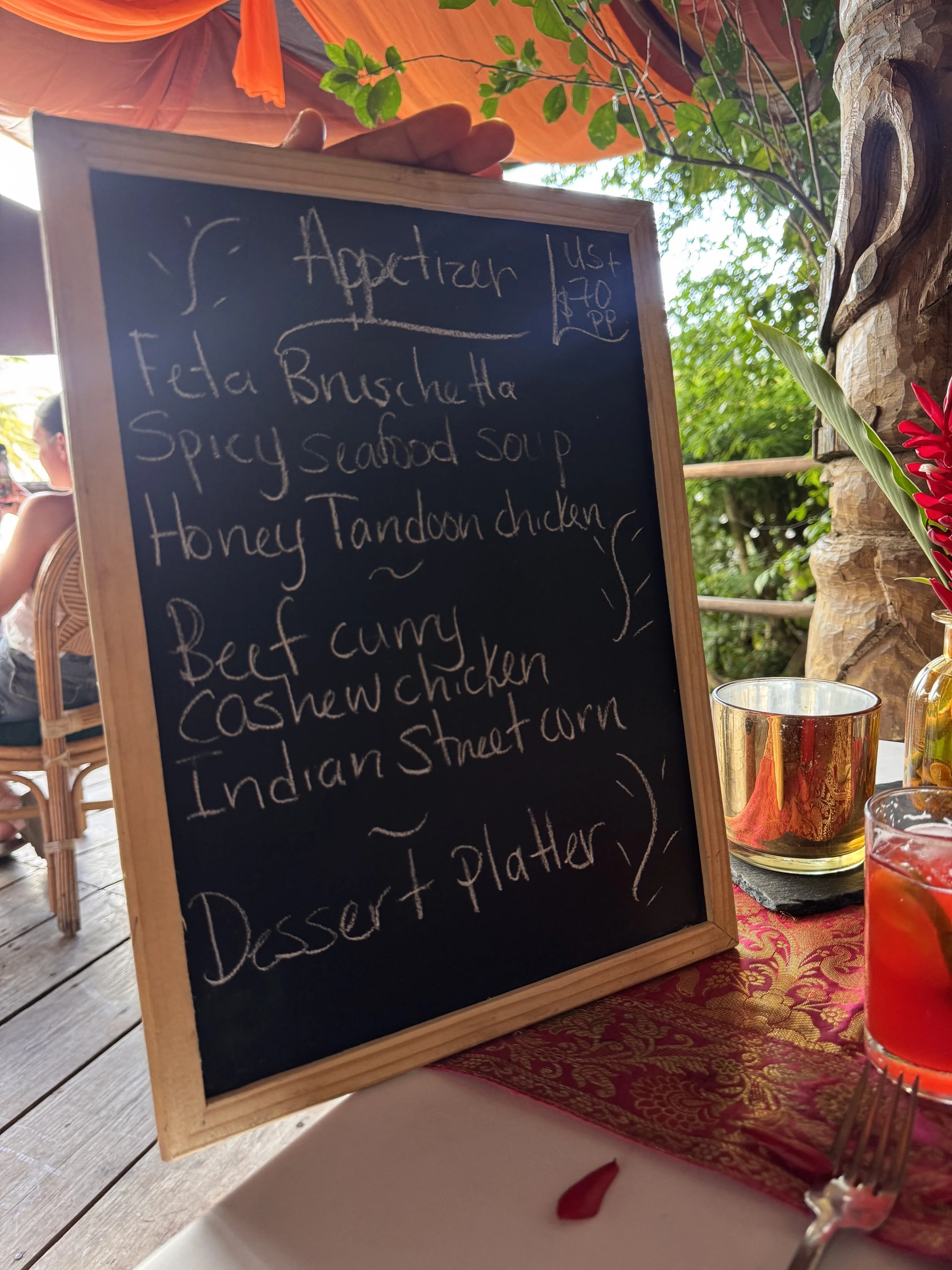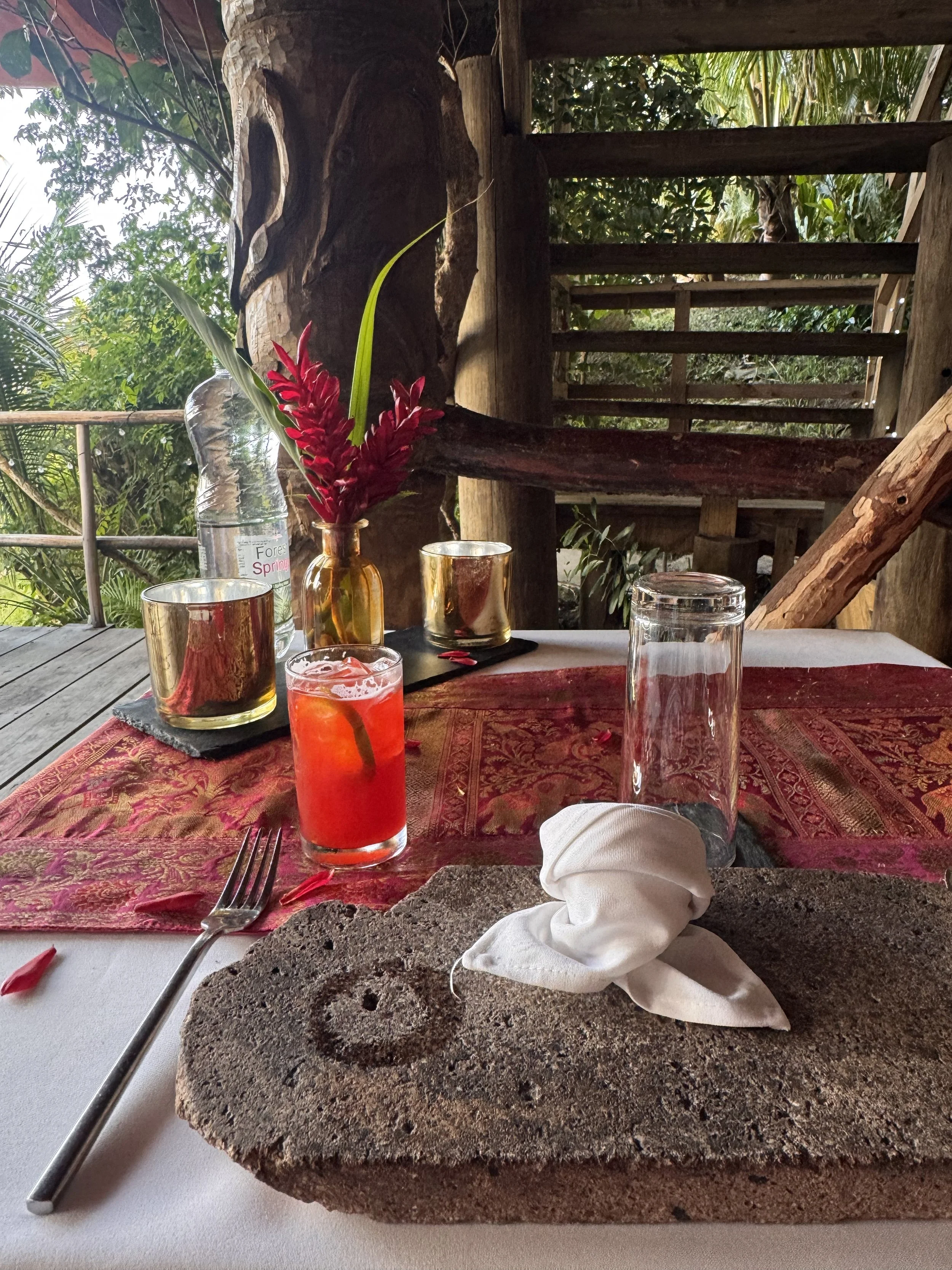 Treetop Restaurant is located at the Crystals Villa Hotel, high up in the hills accessible via some very windy roads. When you arrive, you’re given a delicious complimentary welcome drink (complimentary meaning it’s included in the $70 you’re paying…). Keep in mind - the subsequent drinks aren’t free.